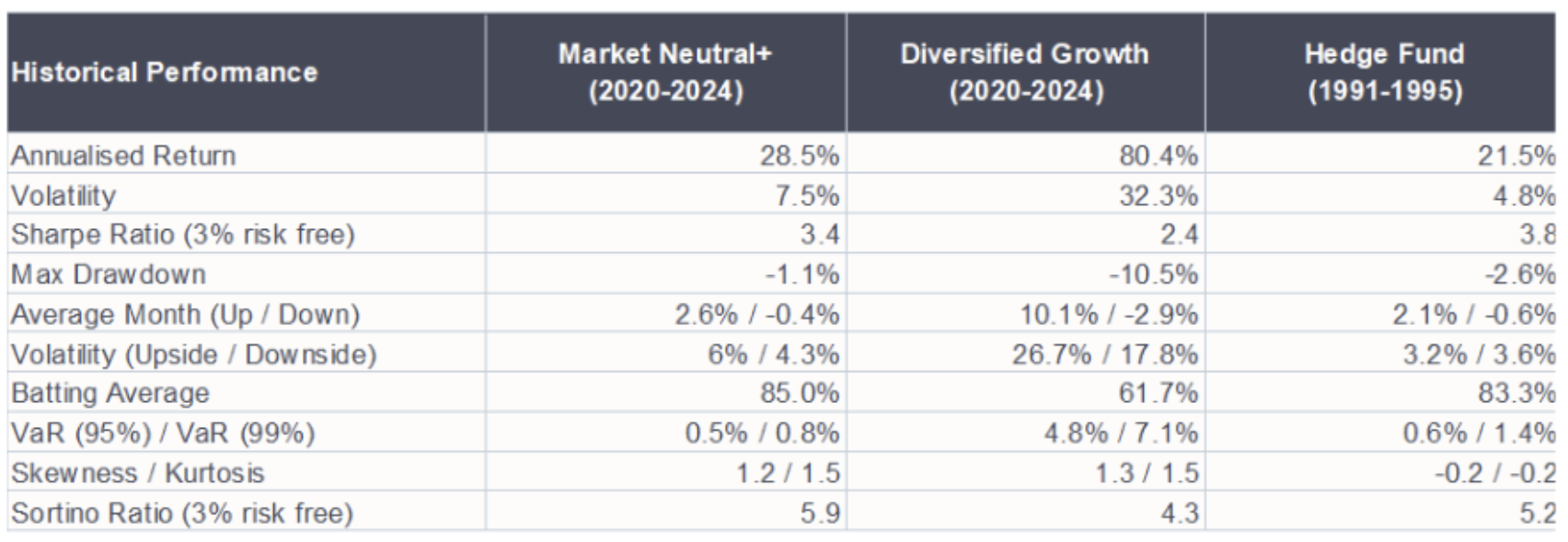 Market Neutral+ achieved a 28.5% annualised return with minimal drawdowns, versus 21.5% for a hedge fund in 1991-1995. Meanwhile, Diversified Growth generated an eye-catching 80.4% return, albeit with high volatility (32%) and deeper drawdowns.